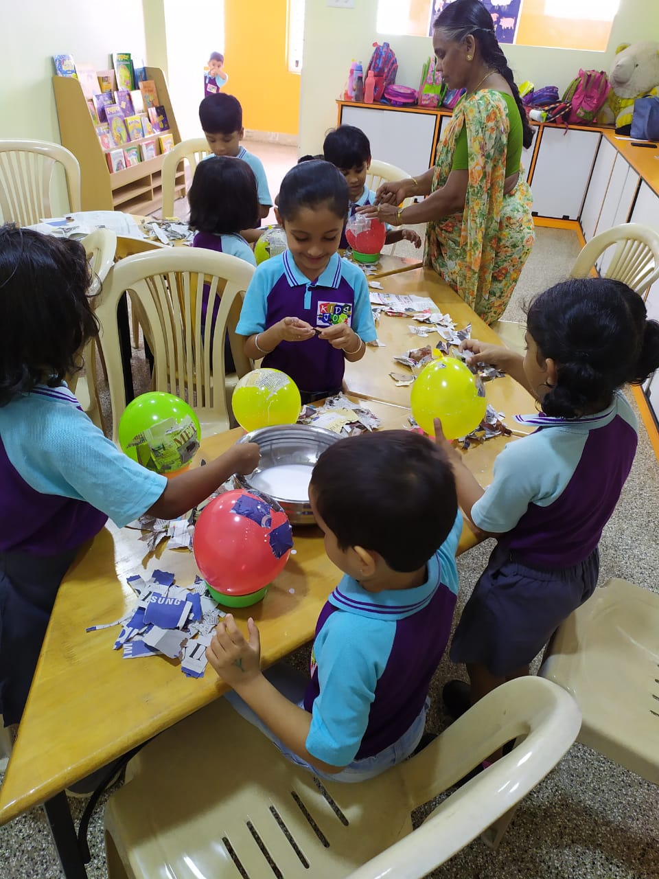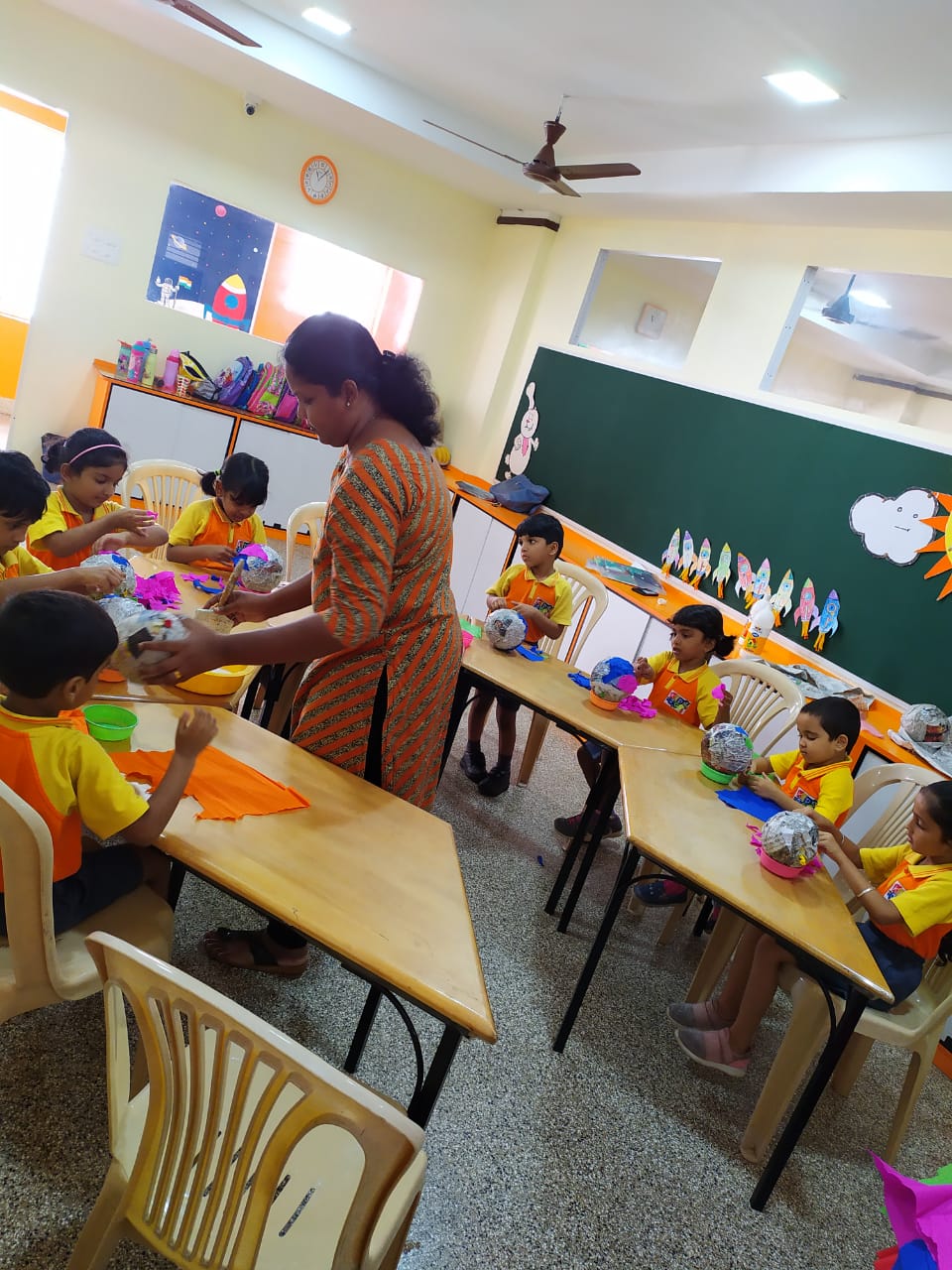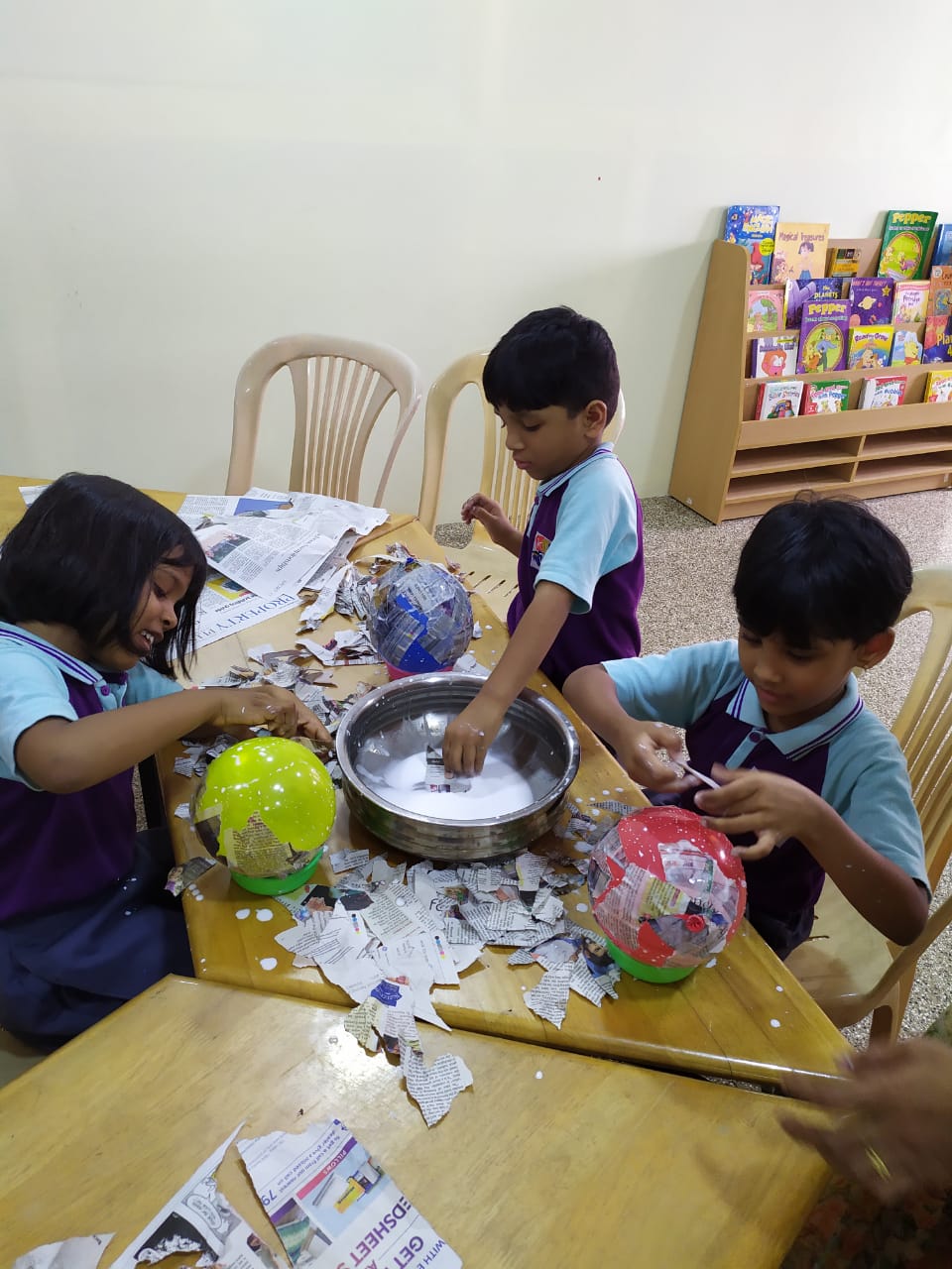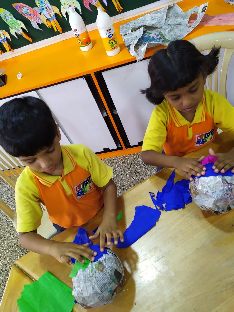 Our theme for the month was ‘The Universe’. We introduced them to what lies beyond the skies – space and the galaxies, and then the solar system. We made some paper mache planets and the children really enjoyed sticking layers of newspaper on the balloons. They then proudly hung it up in their classrooms. They also made ‘Name Rockets’ where they learnt to spell their names and write it down. At Kids Joy we believe that learning should be fun. As much as we can, we try and make it interesting for the children by using art, craft. games, etc. Therefore even a simple exercise like learning to write their name, can be made so much more fun by using methods like these.